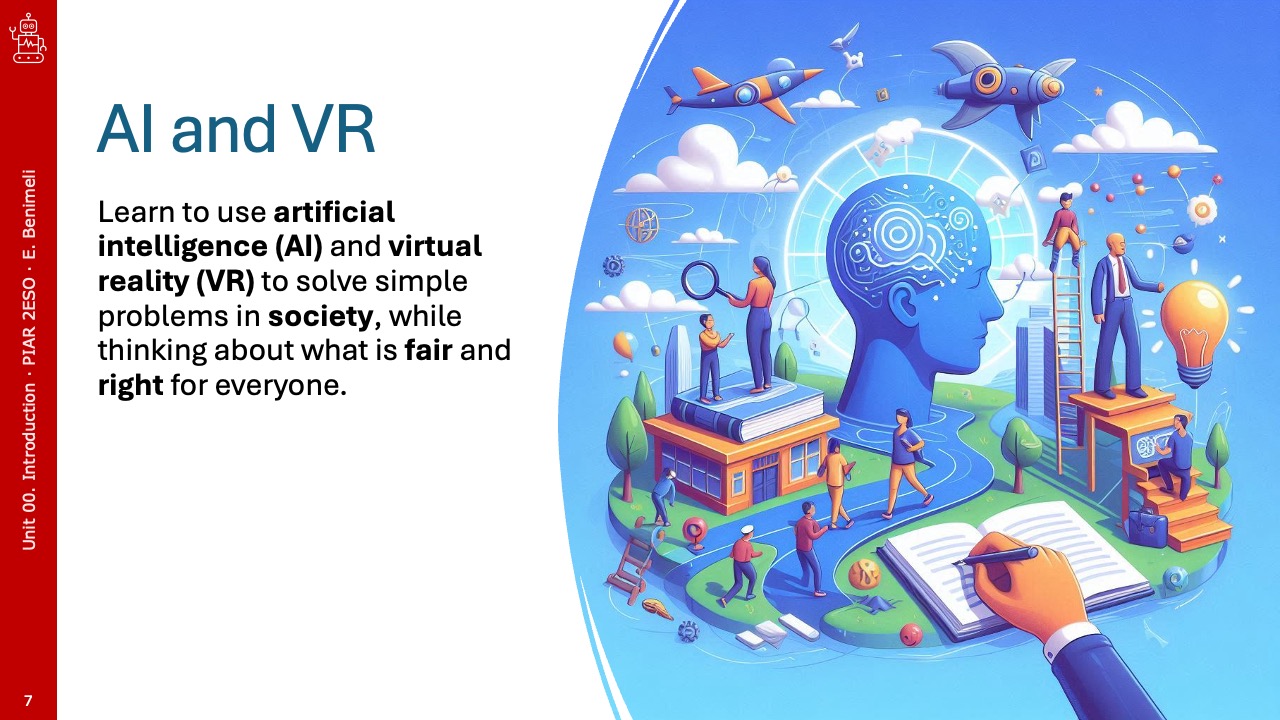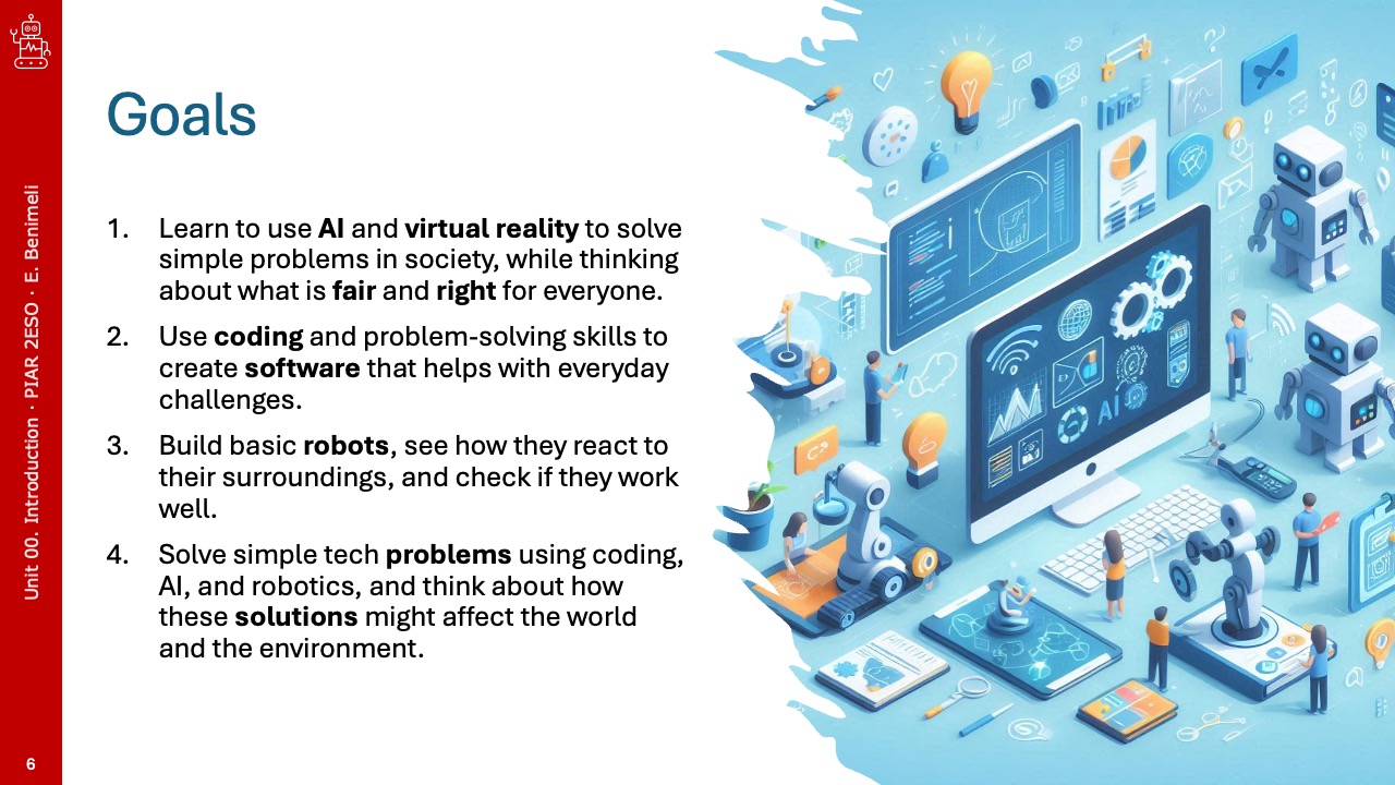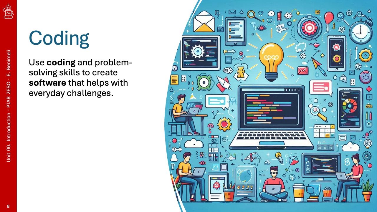 In school, when we learn about artificial intelligence, programming, and robotics, we are using computational thinking, which is like learning to think like a computer. We learn to develop computer programs, use artificial intelligence techniques, and even program robots. We also discuss how these technologies impact society, and we talk about the scientific, ethical, and social aspects of all this. In summary, we are learning very interesting things that help us understand and be part of the modern world.