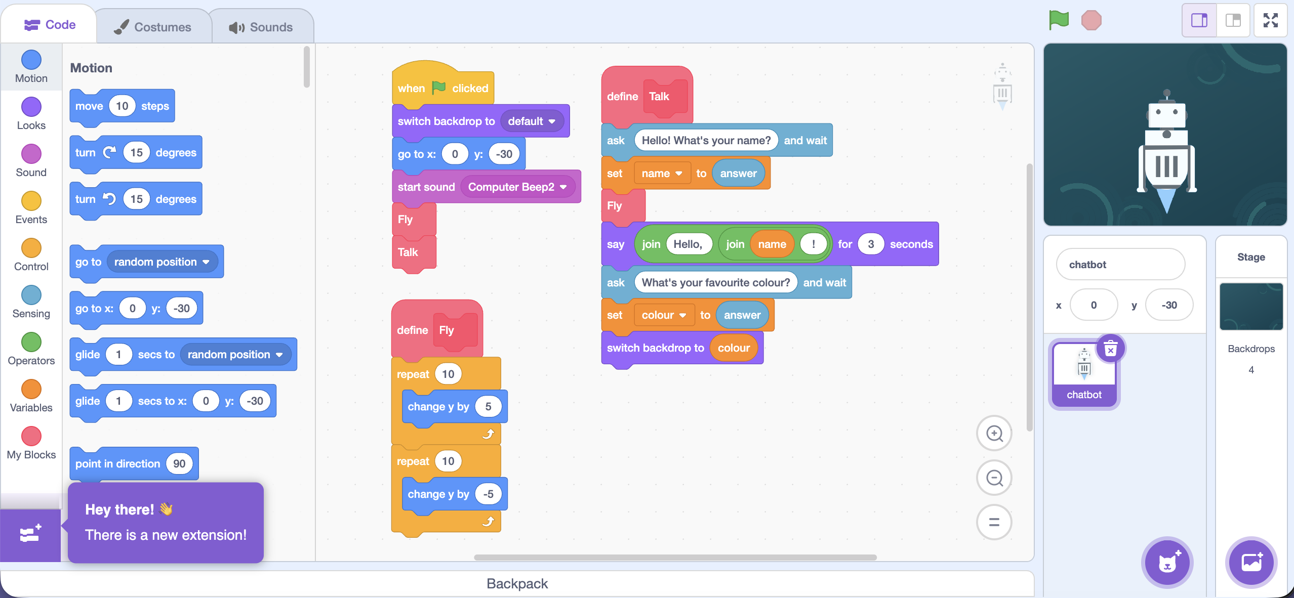 Here is a simple chatbot program created in Scratch. The chatbot talks to the user, asks a few questions, and reacts to the answers.